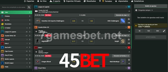 O 45bet oferece uma grande seleção de opções de apostas em e-sports com probabilidades competitivas